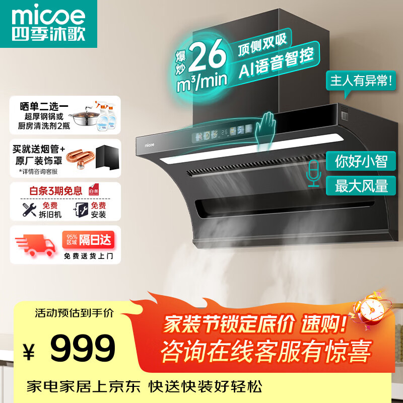 四季沐歌油烟机家用顶侧双吸抽油烟机大吸力厨房抽烟机脱排油烟机免拆自清洗抽烟机一级能效侧顶吸油烟机 [品质升级]D50A-26爆吸|语音控制|燃气监测