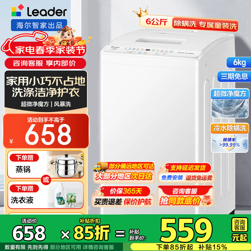 海尔(Haier)海尔智家出品leader波轮全自动洗衣机6/8/10公斤波轮洗衣机家用大神童容量出租神器补贴15%洗衣机 6公斤:超微净魔方+风暴洗+除螨洗+童装洗 波轮