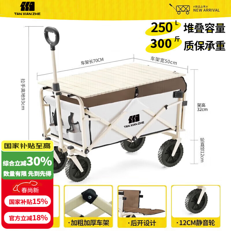 探险者露营车折叠推车户外露营儿童小推车营地车拉年货小拖车聚拢型推车 250L 云峰白-静音实心轮+碳钢桌板