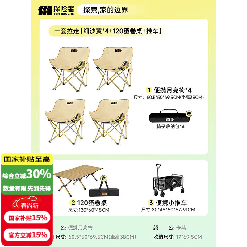 探险者(TAN XIAN ZHE)户外折叠椅露营椅子月亮椅便携折叠桌椅高靠背躺椅小凳子钓鱼椅 一套拉走【细沙黄*4+120蛋卷桌+推车】