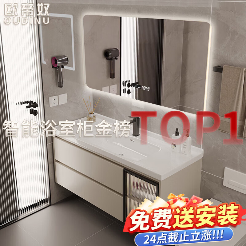 欧帝奴(OUDINU)智能浴室柜 卫生间奶油风陶瓷一体盆洗手洗脸盆柜卫浴洗漱台 组合 智能方镜-陶瓷盆带配件 100cm