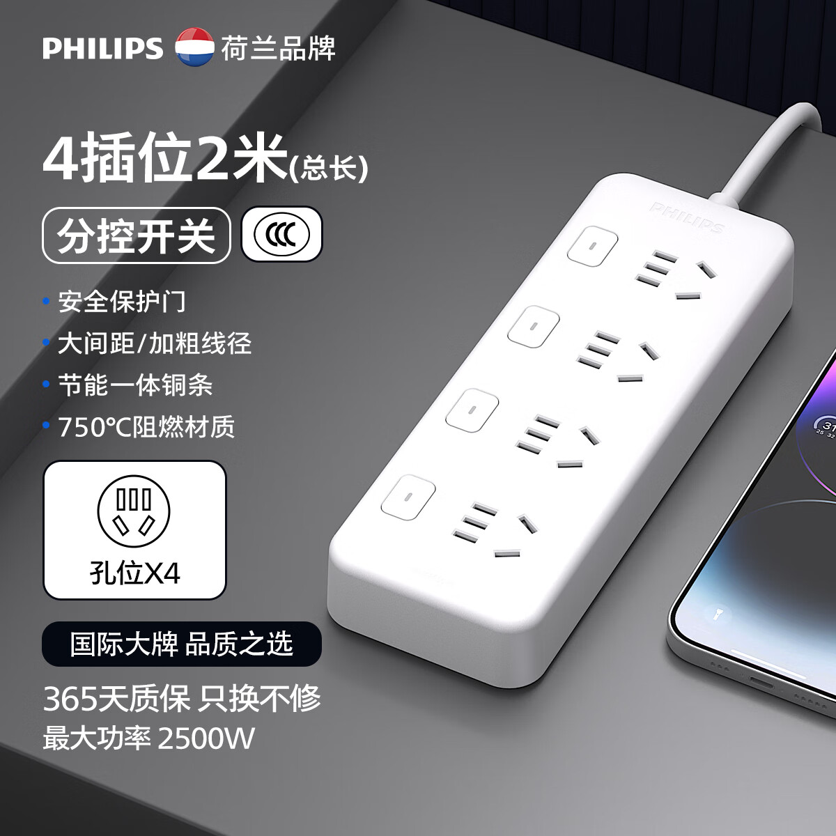 飞利浦分控插排带线排插单独电源分控插座独立开关插盘插头宿舍空调一转多用转换器超长插线板插板 【爆款】分控4插位2米