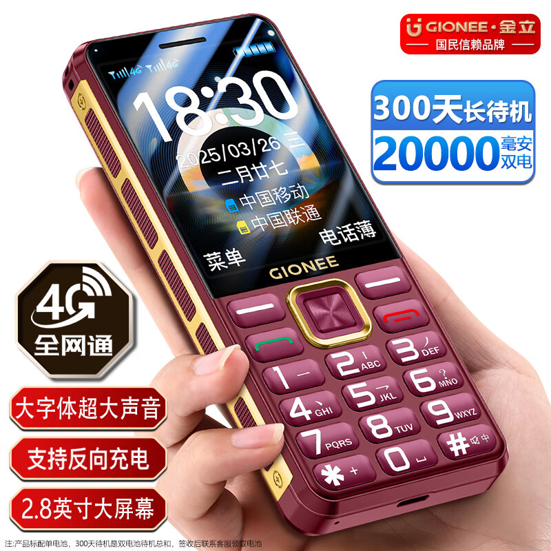 金立(Gionee)老年机10000毫安大电池老年手机超长待机4G全网通2025新款大屏大字大声音老人专用按键功能机 红色