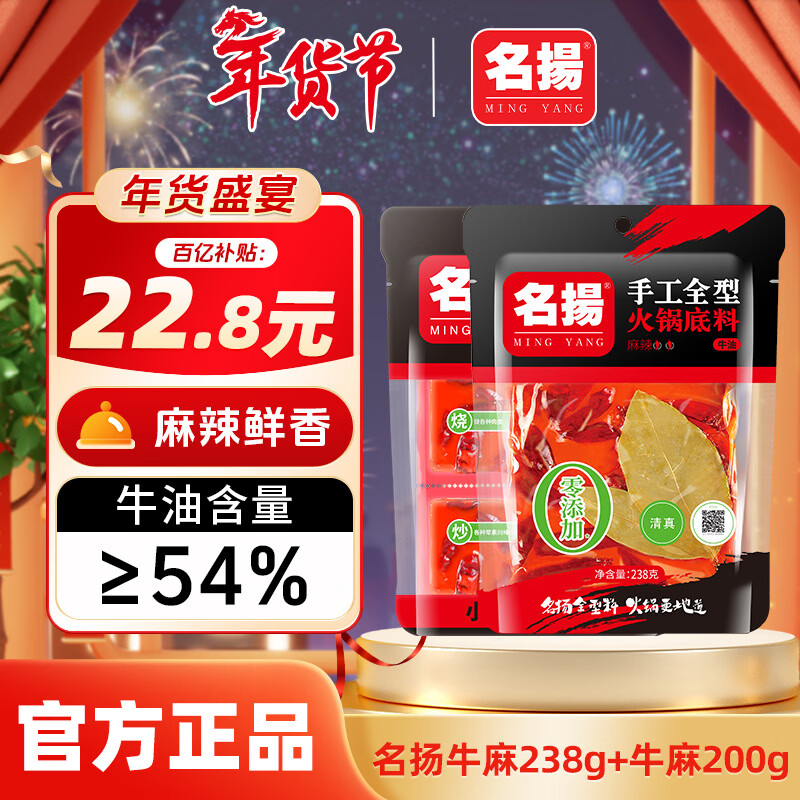 名揚名扬火锅底料牛油麻辣238g/200g麻辣香锅串串调味料家用宿舍四川 【组合推荐】牛麻238g+牛麻200g