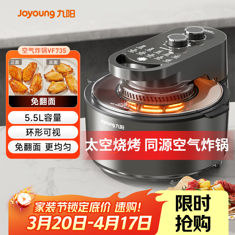 九阳(Joyoung)太空空气炸锅不用翻面空气炸锅家用可视大视窗5.5L大容量免翻面多功能不沾易清洗蒸烤一体机 VF735