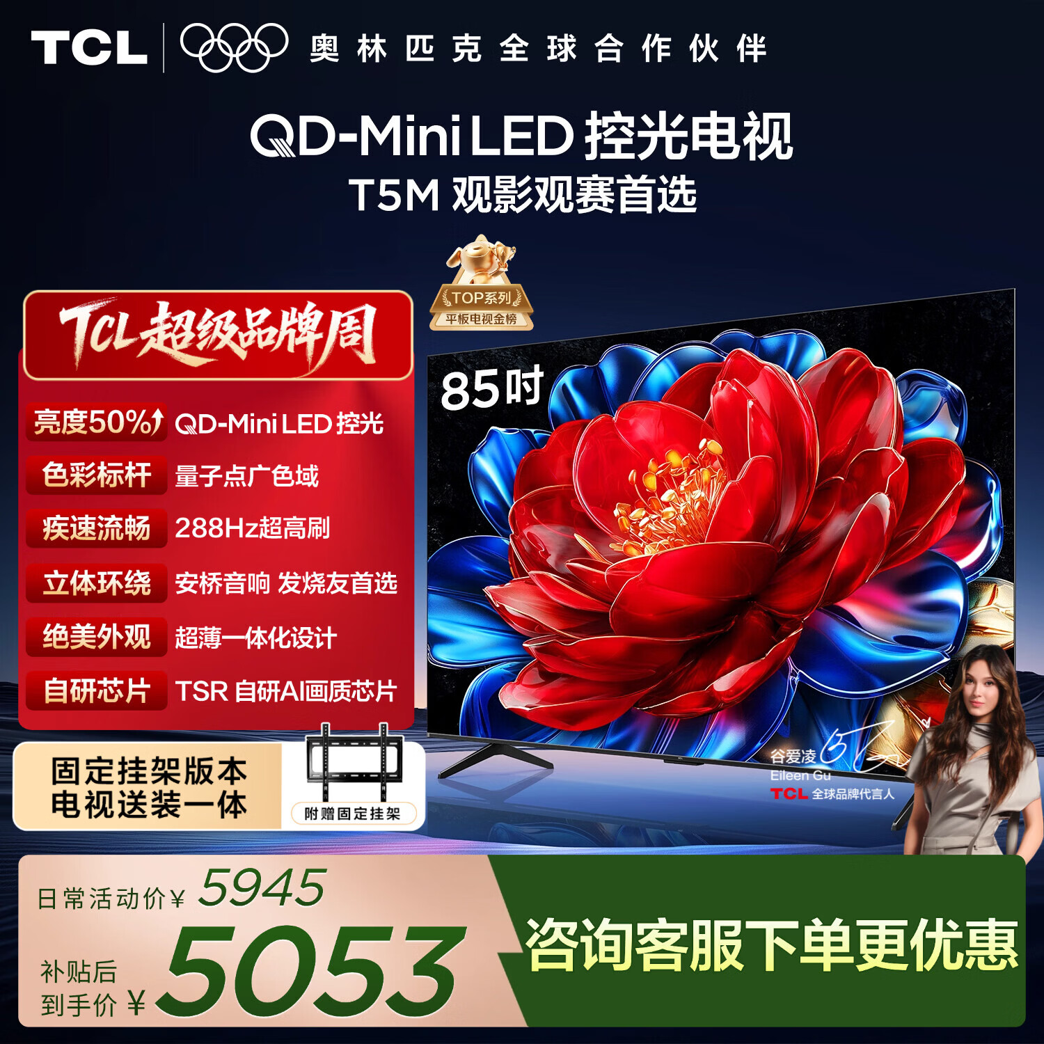 TCL 85T5M 包安装版【固定挂架送装一体】85英寸 QD-Mini LED控光电视 T5M 国家补贴 护眼