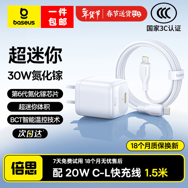 倍思苹果17充电器30W/20W可折叠快充头套装Type-C数据线适用iPhone17/16/15proMax/14手机iPad平板 【30W氮化镓升级款C-L】苹果8-14白1.5米 适用苹果全系-安全快充不伤机