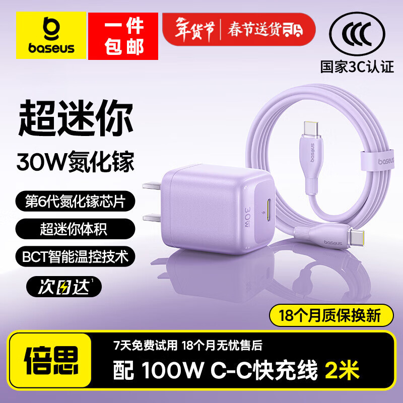 倍思苹果17充电器30W/20W可折叠快充头套装Type-C数据线适用iPhone17/16/15proMax/14手机iPad平板 【30W升级款氮化镓双C套装】苹果15-17紫2米 适用苹果全系-安全快充不伤机