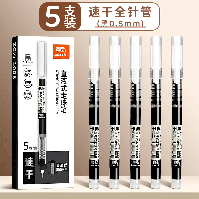 真彩直液式中性笔黑色0.5mm全针管速干大容量巨能写商务办公走珠签字笔学生文具考试刷题笔水笔 【速干全针管】5支-黑色 0.5mm