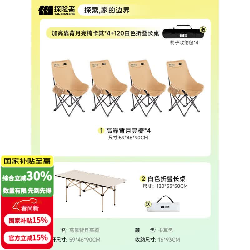 探险者月亮椅户外折叠椅露营椅子高靠背便携高背钓鱼野餐沙滩桌椅全装备 【颜值性价比】高背卡其*4+120款米白折叠桌
