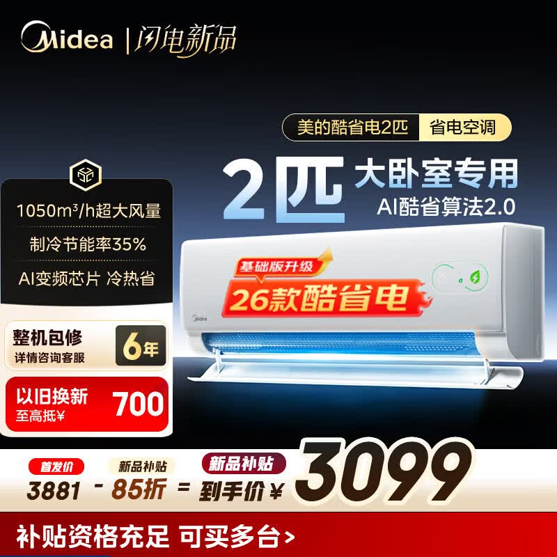 美的(Midea)空调挂机1匹/1.5匹卧室挂式2匹空调酷省电二代一级能效变频冷暖两用官方旗舰店以旧换新国家补贴 大卧室专用 酷省电二代 2匹 26年新品