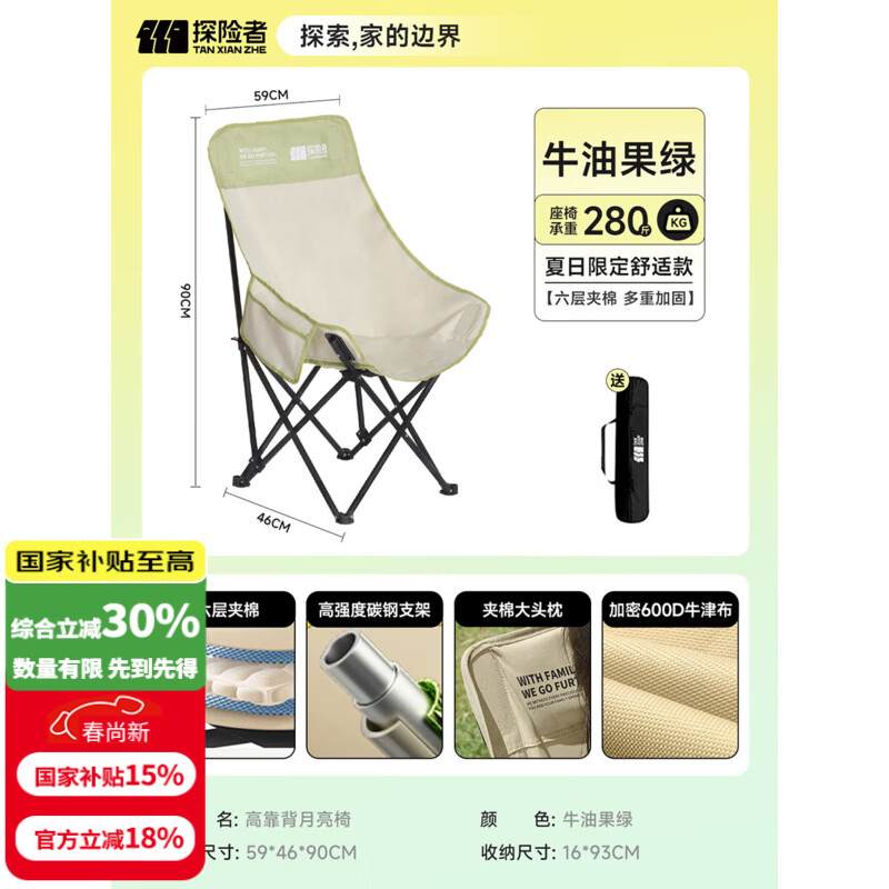 探险者月亮椅户外折叠椅露营椅子高靠背便携高背钓鱼野餐沙滩桌椅全装备 夏日限定牛油果绿【六层夹棉】