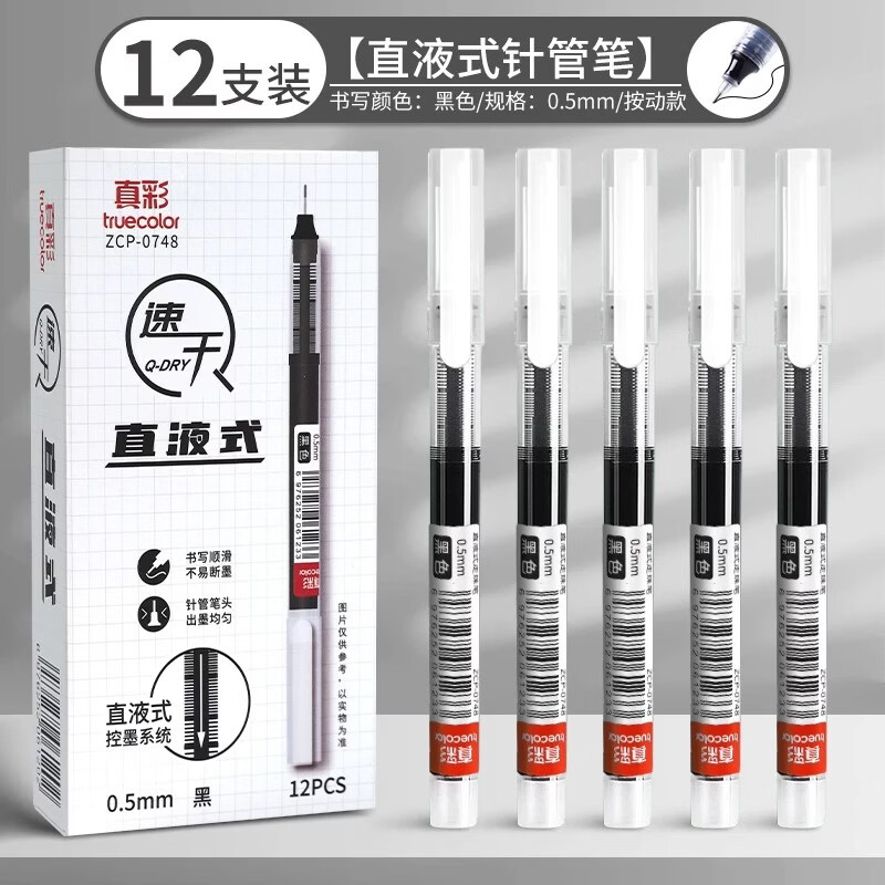 真彩直液式中性笔黑色0.5mm全针管速干大容量巨能写商务办公走珠签字笔学生文具考试刷题笔水笔 【刷题笔】12支-黑色 0.5mm