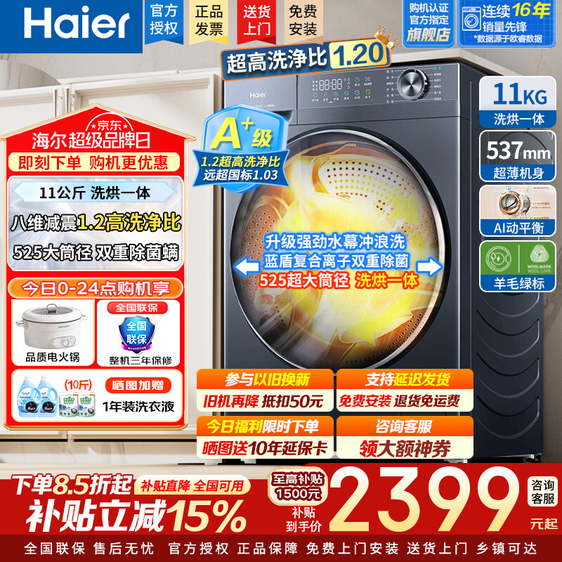 海尔(Haier)洗衣机滚筒全自动出品家用10公斤大容量洗烘一体一级能效除菌变频超薄以旧换新家电补贴15% 蓝盾除菌丨洗净比1.2丨超薄平嵌 滚筒洗烘 11kg