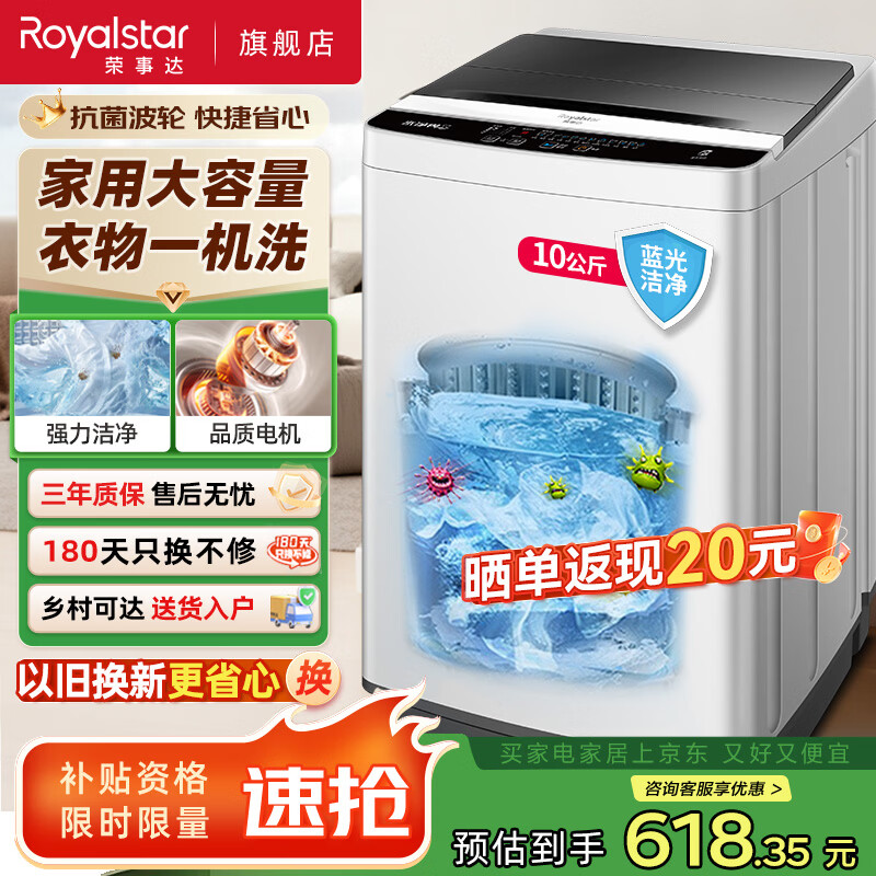荣事达(Royalstar)8公斤全自动洗衣机大容量波轮家用租房节能省电一键脱水 10KG蓝光洁净【智能风干 节能省水】 波轮