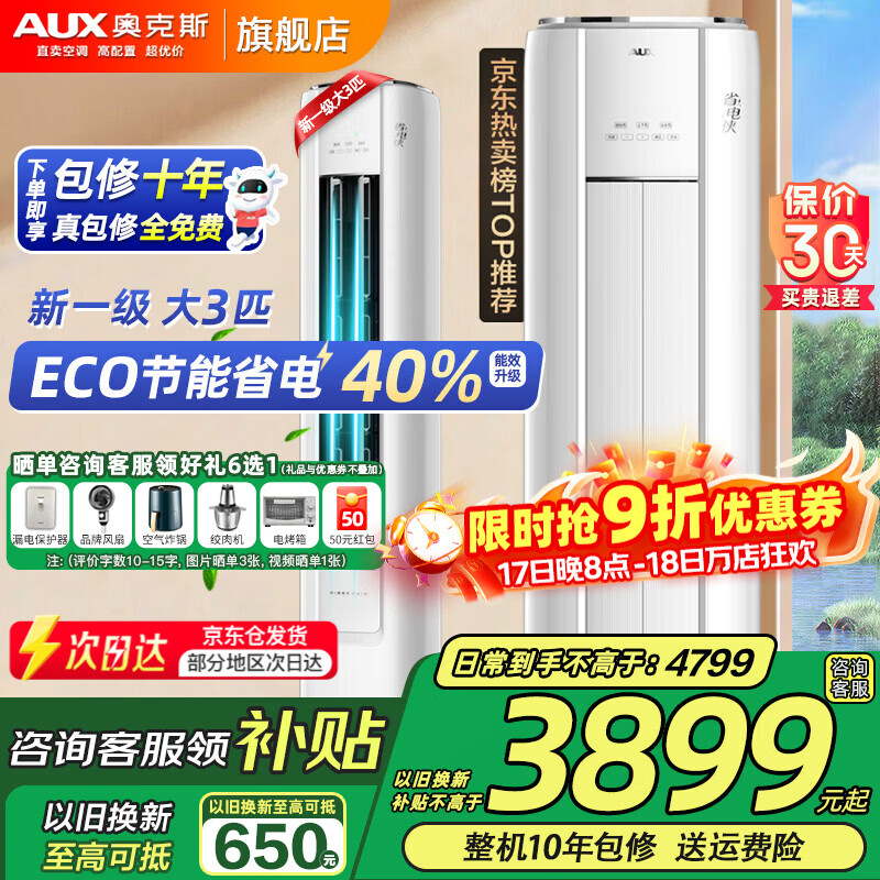 奥克斯(AUX)大3匹新一级三级能效柜机空调立式2P 家电补贴20% 变频冷暖省电 自清洁高温除菌立柜式空调 大3匹 一级能效 【ECO节能40%】32-48平 【强劲冷暖 除菌自清洁】