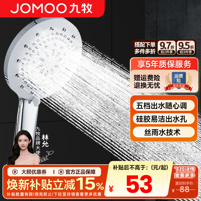 九牧(JOMOO)花洒喷头全套家用增压洗澡淋浴莲蓬头热水器手持淋雨花洒软管套装 丝雨五功能花洒喷头S175015