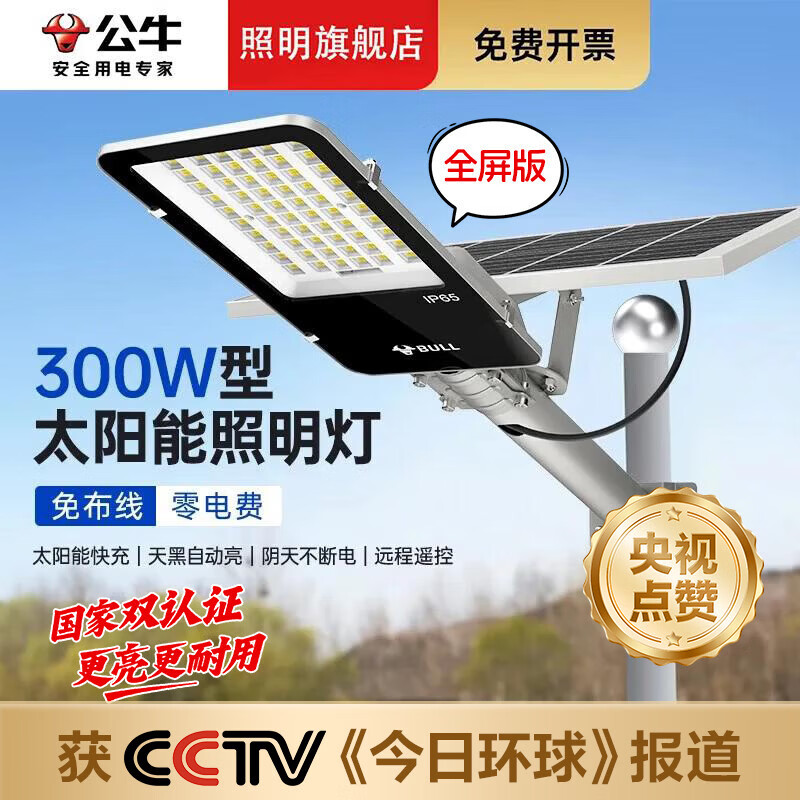 公牛(BULL)太阳能户外照明灯新款大功率庭院灯农村用天黑自动亮防水led路灯 升级国家双认证全屏板300W型