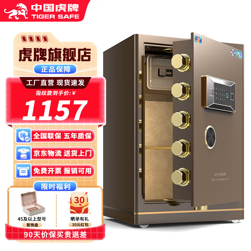 虎牌【CSP国标认证 CE欧盟认证】保险柜家用小型办公大型保险箱防火防盗全钢重型加厚防搬走可入墙 【热销爆款】高60cm 咖色 指纹款(指纹/密码/钥匙开启)