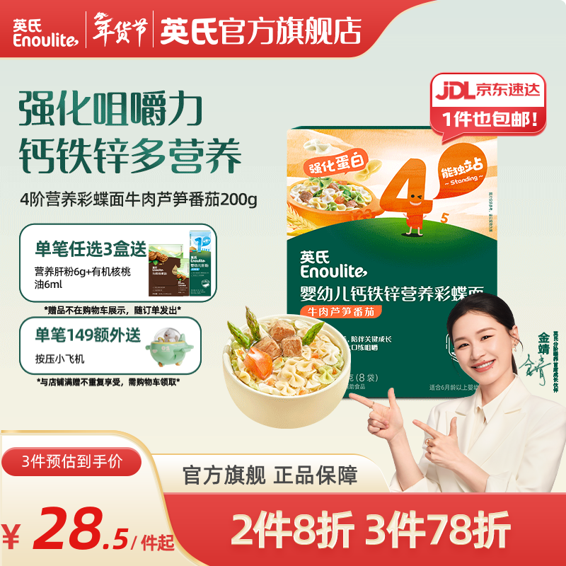 英氏(Engnice)【宝宝面条专区】婴幼儿有机面条辅食儿童意面碎碎面蝴蝶面 4阶钙铁锌彩蝶面牛肉芦笋番茄200g