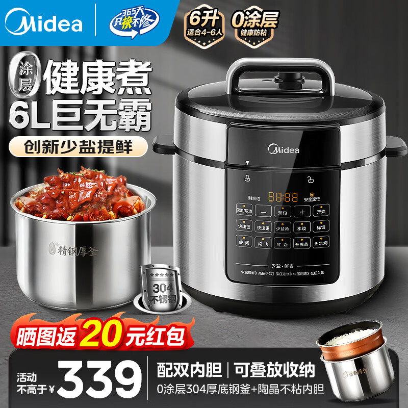 美的(Midea)电压力锅 电高压锅 家用压力锅6升高压电饭锅0涂层不锈钢不粘加深双内胆3-12人一键排气炖肉电饭煲 【少盐提鲜】0涂层不锈钢 6L