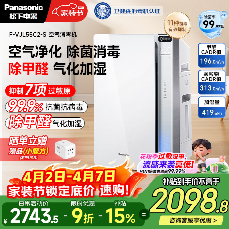 松下(Panasonic)家用空气净化器除甲醛除菌 宠物除异味 除花粉除过敏源消毒机卫健委备案加湿器一体机55C2
