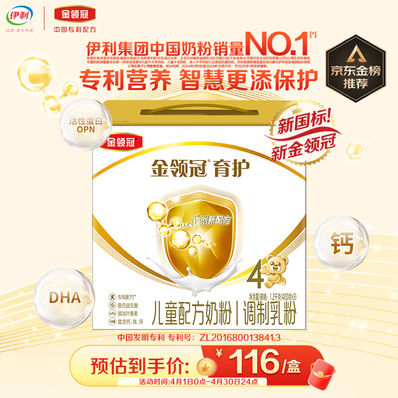 伊利金领冠育护儿童配方奶粉4段3-6岁1200g*1盒 3.8倍高钙|4亿益生菌
