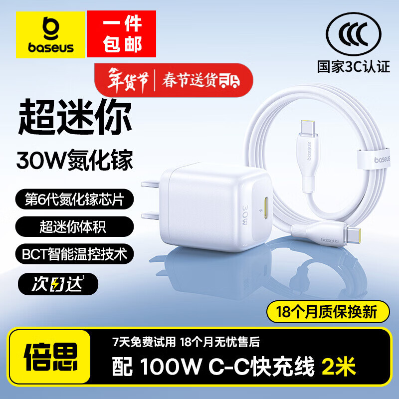 倍思苹果17充电器30W/20W可折叠快充头套装Type-C数据线适用iPhone17/16/15proMax/14手机iPad平板 【30W升级款氮化镓双C套装】苹果15-17白2米 适用苹果全系-安全快充不伤机