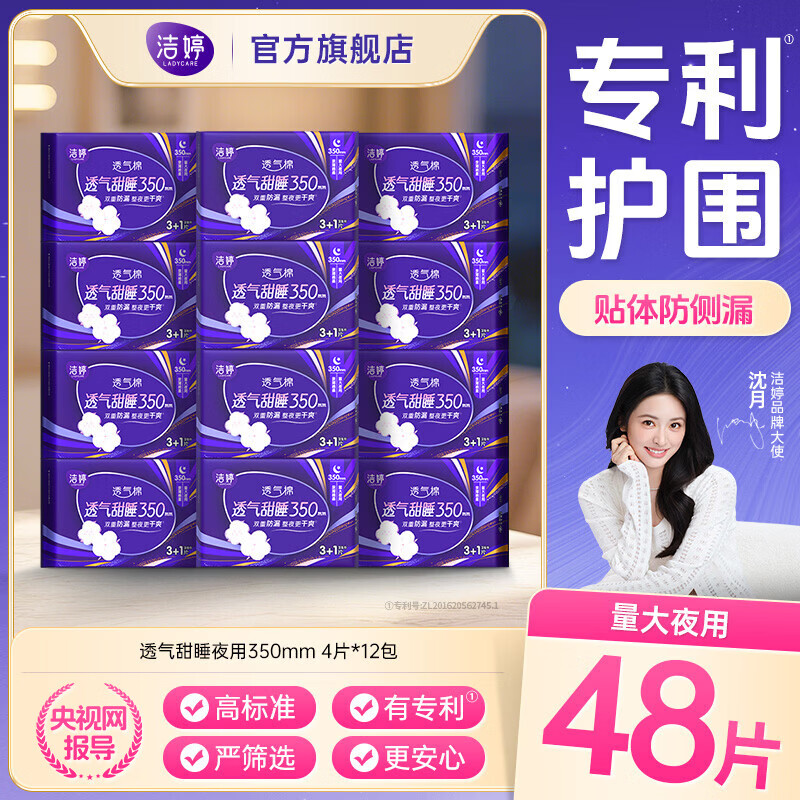洁婷绵柔卫生巾透气双U日夜用姨妈巾组合套装 加长夜用350mm48片