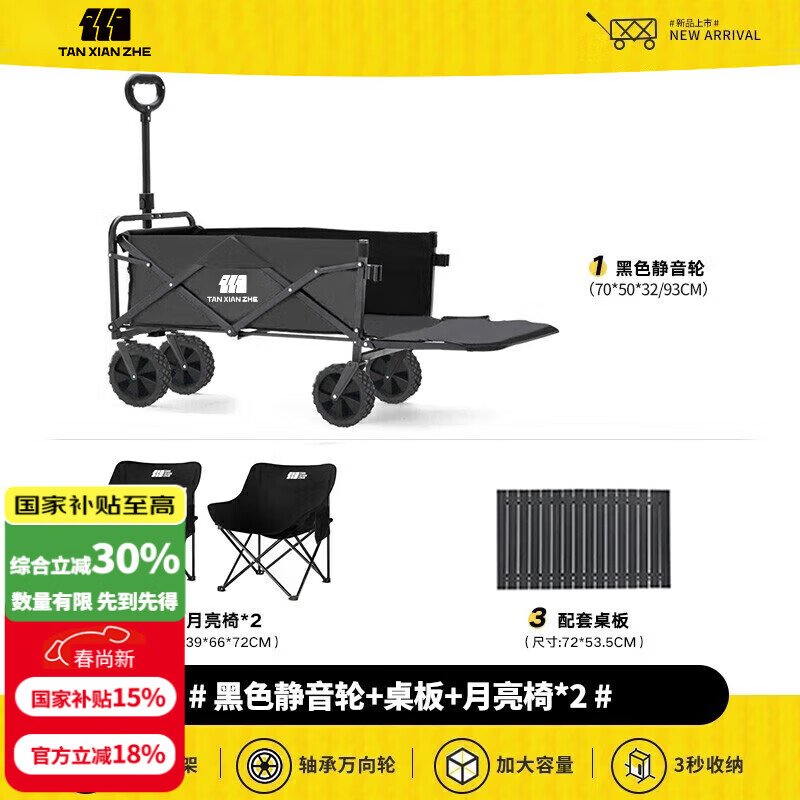 探险者露营车折叠推车户外露营儿童小推车营地车拉年货小拖车聚拢型推车 250L 曜石黑静音轮+桌板+月亮椅*2