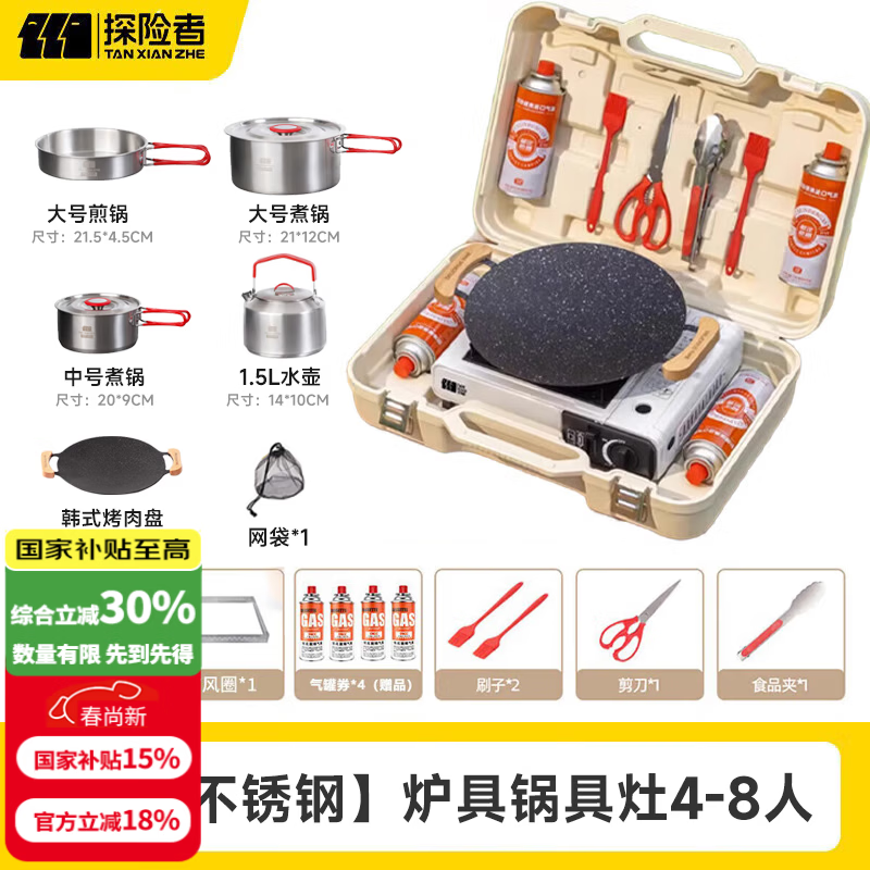 探险者卡式炉户外卡式炉具套装防爆卡磁炉全套带锅烤盘露营野餐烧烤卡斯 【304不锈钢】炉具锅具灶4-8人