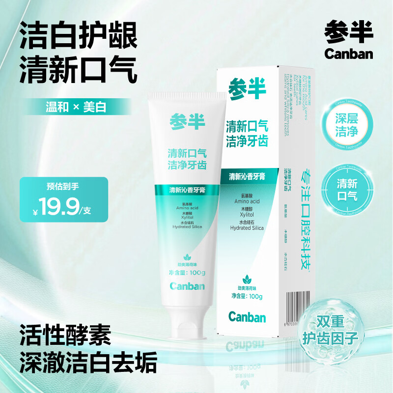 参半清新沁香牙膏酵素洁白去渍清新口气温和清洁 劲爽薄荷 100g*1支