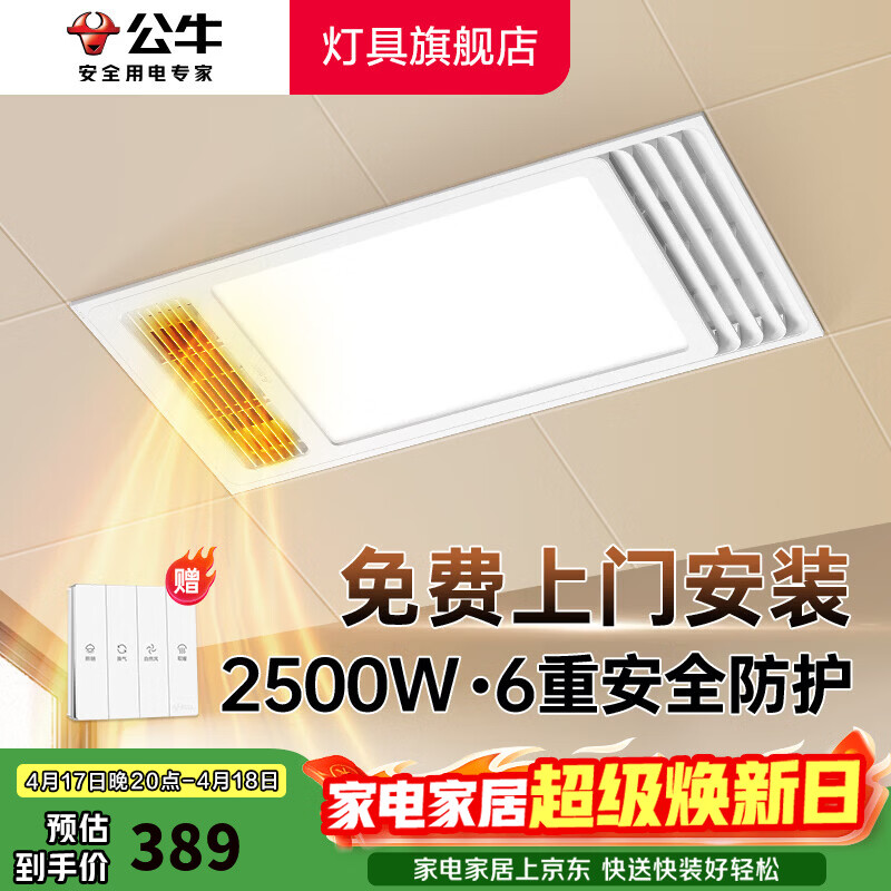 公牛(BULL)风暖浴霸照明灯排气一体集成300x600 多功能浴室卫生间暖风机官方 Y25A+转换框适用非集成吊顶 官方家用吊顶一体机+高效速热 2026年推荐