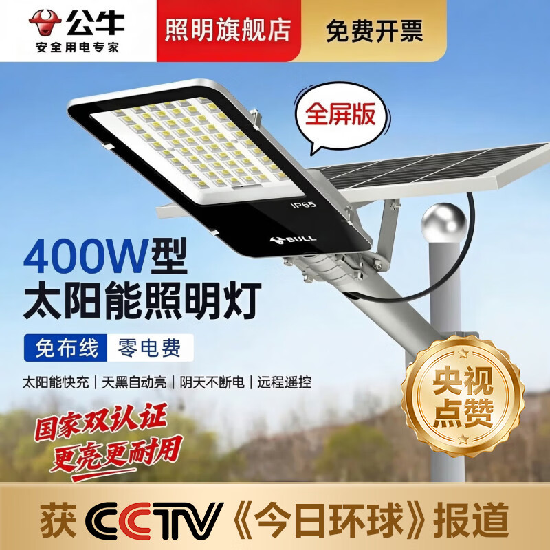 公牛(BULL)太阳能户外照明灯新款大功率庭院灯农村用天黑自动亮防水led路灯 升级国家双认证全屏板400W型