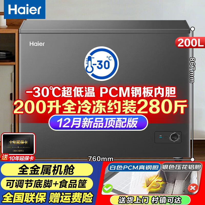 海尔(Haier)出品单温冰柜家用无需频繁除霜冷藏柜冷冻柜租房小型冰箱 200升 新品顶配【零下30度+PCM钢板】