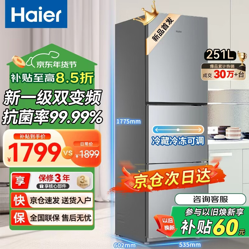 海尔(Haier)冰箱家用三开门风冷无霜节能超薄电冰箱两天约一度电新等级能效省电小户型冰箱以旧换新补贴 251升三门一级风冷无霜冰箱省电