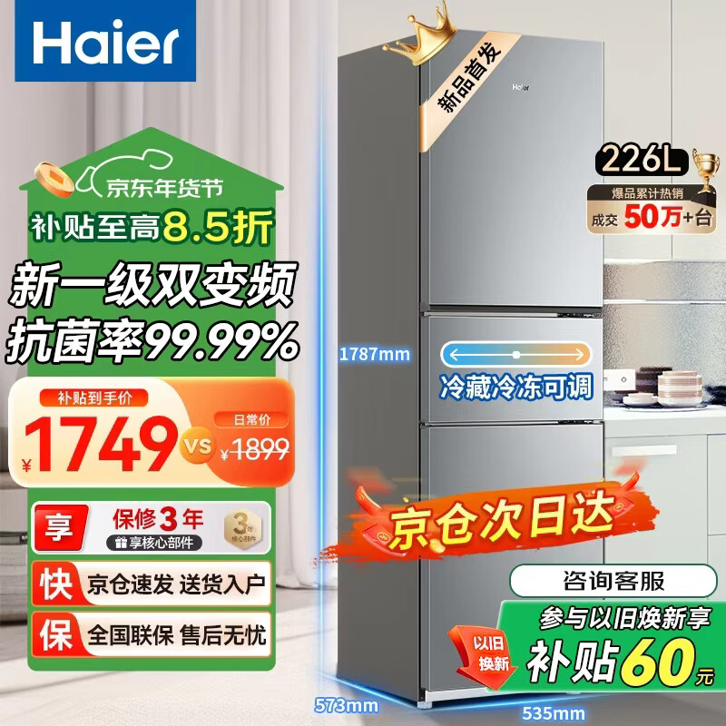 海尔(Haier)冰箱家用三开门风冷无霜节能超薄电冰箱两天约一度电新等级能效省电小户型冰箱以旧换新补贴 226升三门一级风冷无霜冰箱省电