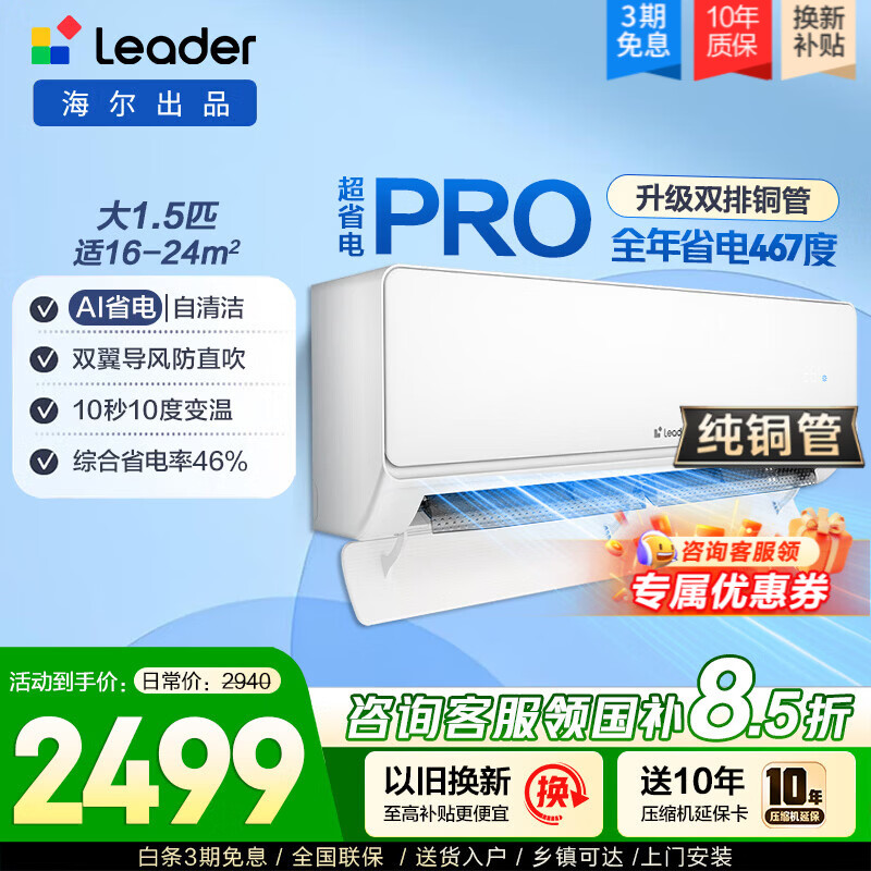 海尔空调出品统帅新1级纯铜管超省电大1.5匹AI智能挂机空调 大风量防直吹卧室冷暖两用空调 以旧换新 【大双排铜管】超省电pro|全能省电王