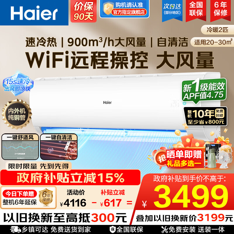 海尔(Haier)【国家补贴】空调挂机大1匹/1.5匹小红花净省电一级能效双排铜管蒸发器变频冷暖壁挂式 以旧换新 【净省电】2匹丨专利自清洁丨天幕式送风