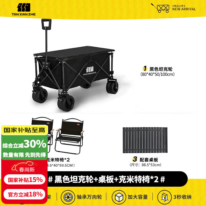 探险者露营车折叠推车户外露营儿童小推车营地车拉年货小拖车聚拢型推车 200L 极光黑宽轮+桌板+克米特椅*2