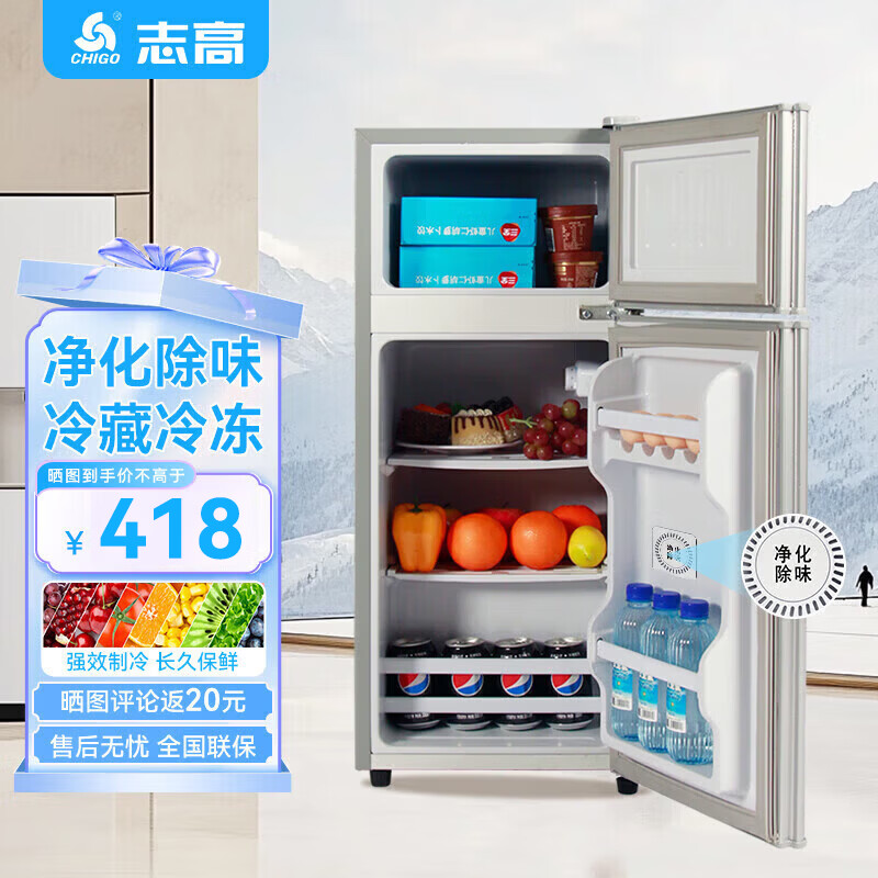 志高双门冰箱小型出租房宿舍双开门冷藏冷冻一级能效家用大容量办公室电冰箱二门微霜 【净化去味】82L银色【高效保鲜 铜管速冷】