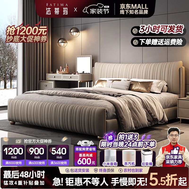 法蒂玛现代简约轻奢贝壳真皮床主卧室奶油风高端大气双人婚床2026新款 单床 2*2.2米框架结构【厚实稳重】