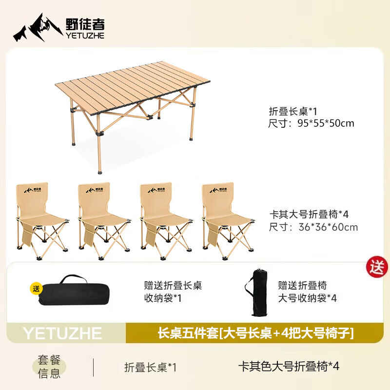 野徒者露营桌椅全套户外桌椅折叠椅野餐一桌四椅户外露营装备野炊蛋卷桌 95cm5件套【卡其长桌+4把椅子】 新款升级