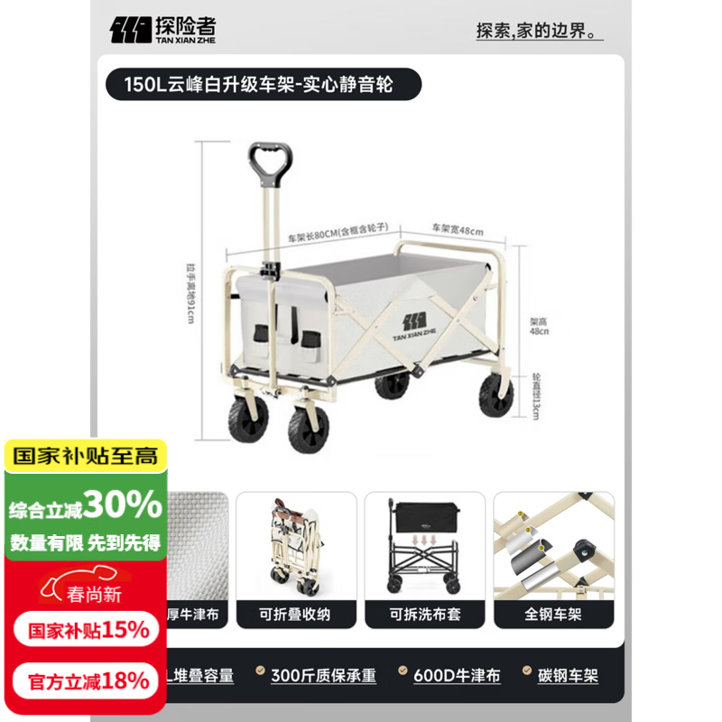 探险者(TAN XIAN ZHE)户外露营小推车折叠露营推车营地拖车野餐桌板手拉车摆摊快递车 150L 云峰白升级车架-实心静音轮