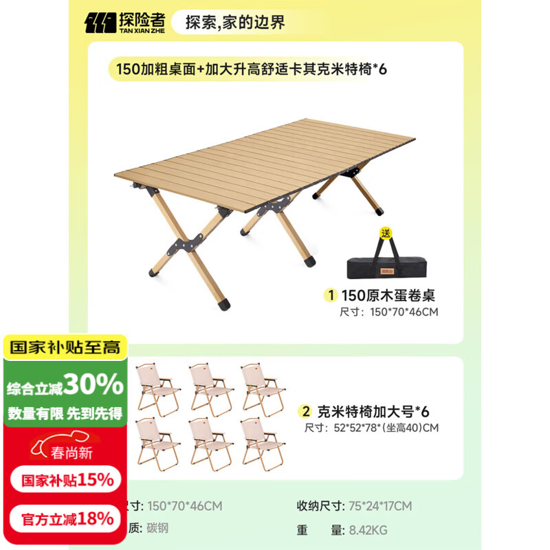 探险者(TAN XIAN ZHE)户外蛋卷桌折叠桌便携式桌椅套装露营桌子一套野餐桌装备全套摆摊 150稳固木色桌+6*加大升高卡其克米特椅