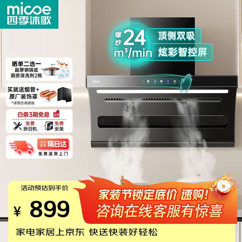 四季沐歌油烟机家用顶侧双吸抽油烟机大吸力厨房抽烟机脱排油烟机免拆自清洗抽烟机一级能效侧顶吸油烟机 [爆款升级]D50B-24爆吸|挥手启动|热清洗