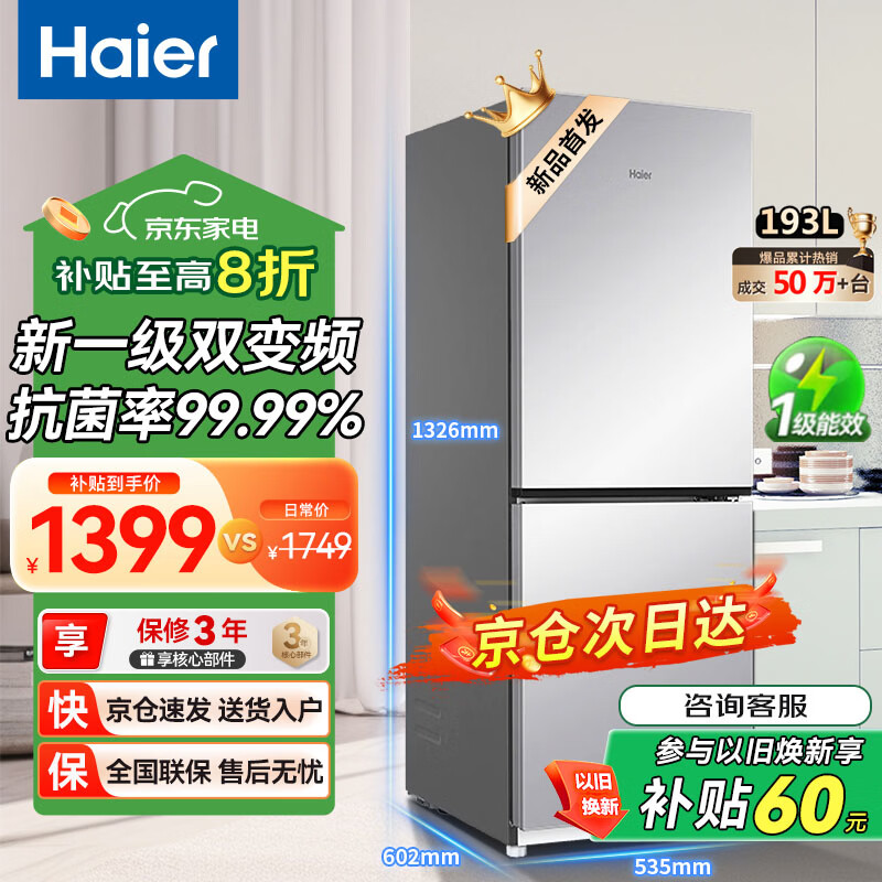 海尔(Haier)冰箱双开门小型冰箱风冷无霜节能超薄电冰箱出租房家用两天约一度电新等级能效省电小冰箱以旧换新 193升风冷无霜一级能效双变频省电