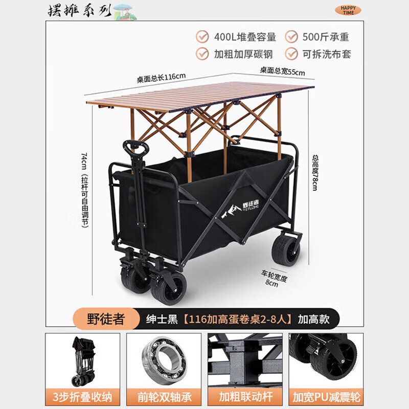野徒者露营车户外推车野餐车儿童可躺露营装备折叠摆摊营地车小买菜车 黑巨无霸-16寸【飞机轮】116桌子 升级加粗全钢车架