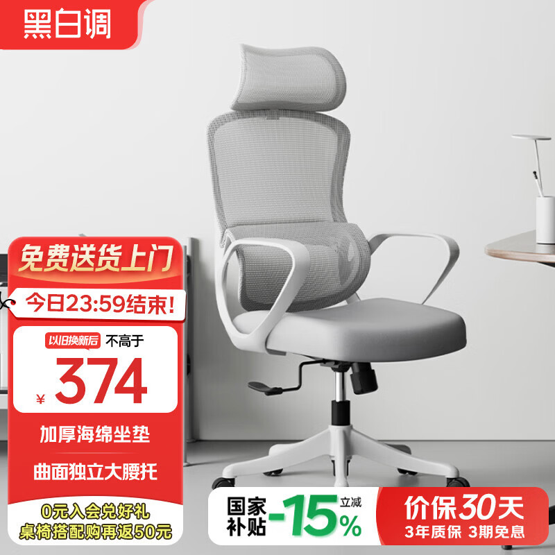 黑白调P1人体工学椅电脑椅办公椅子人工力学座椅久坐学习椅4向腰托 P1air-【原生海绵坐垫】霜白 带颈枕