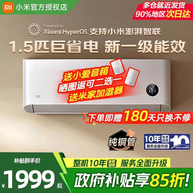小米(MI)米家新款1.5匹巨省电 双排款 健康风 变频冷暖智能互联自清洁一级能效壁挂式卧室客厅家用空调挂机 1匹 一级能效 巨省电睡眠款【低噪运行】